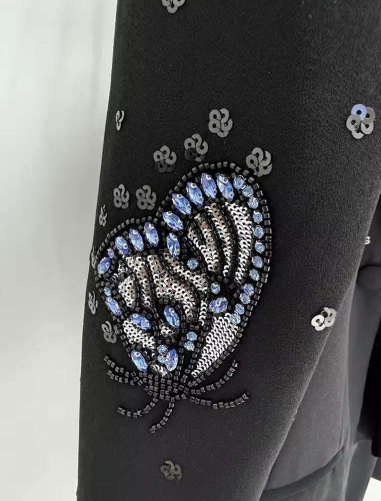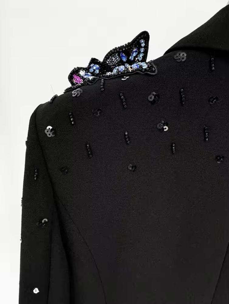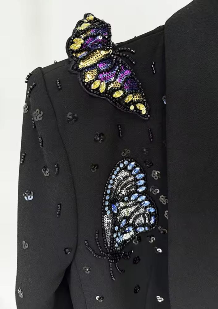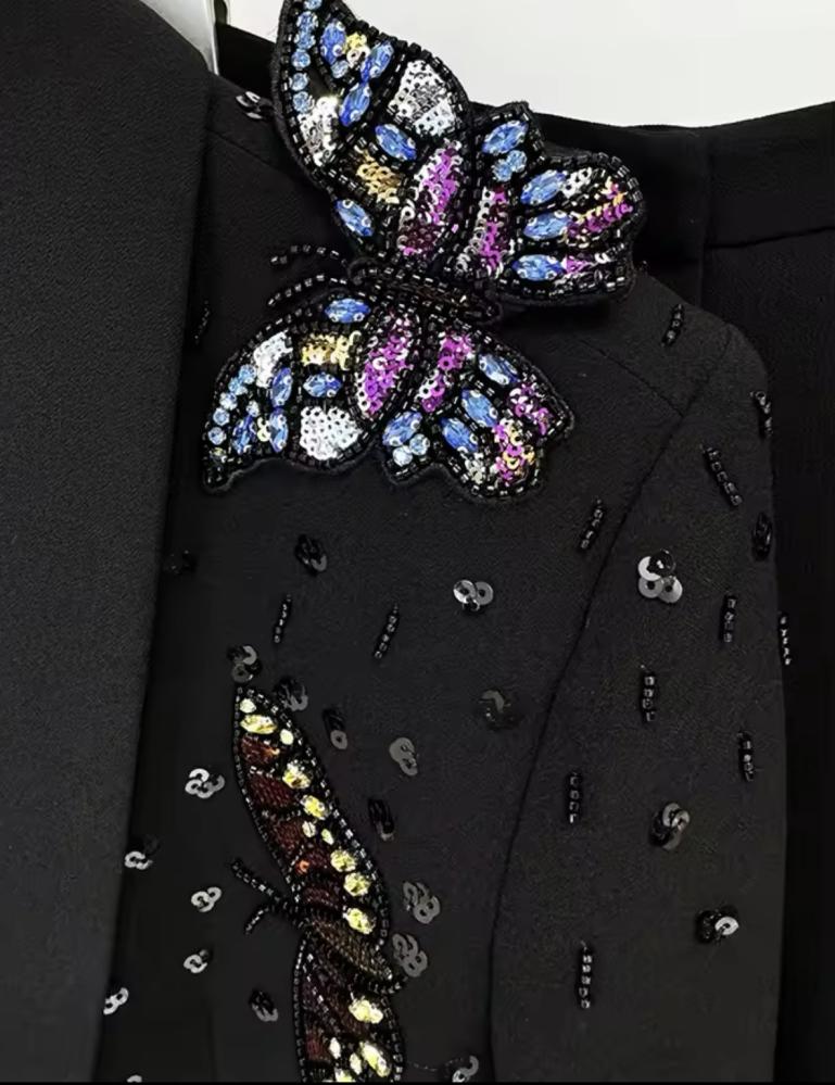 Step into the realm of high fashion with "Ethereal Elegance" – a breathtaking suit designed for those who appreciate luxury and artistry. The blazer features an exquisitely tailored silhouette with delicate front draping, adorned with hand-embroidered butterflies crafted from shimmering crystals and gemstones. The structured shoulders add a dramatic flair, while the wide-leg trousers ensure a graceful and commanding presence. A perfect choice for grand events and statement looks.